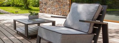 Планируя наполнение террасы, подумайте о многофункциональности. Складные механизмы из анодированного алюминия позволяют убирать объемные кресла в закрытую зону на время затяжных дождей или зимнего сезона.